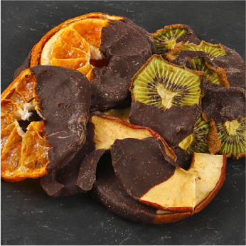 今回採用したドライフルーツは酸味のあるフルーツです。フルーツの酸味とチョコレートの甘味の絶妙な配合バランスを重視しました。ドライフルーツの味をより引き出すのがチョコレートになっています。